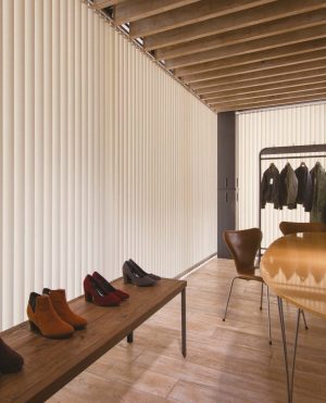 カーブ窓専用のバーチカルブラインド。ショールームや店舗などの窓、間仕切りに便利です。