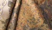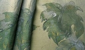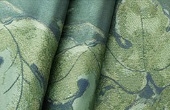 瑞々しい葡萄の葉とつるが幾重にも重なる奥行きを感じるデザイン。緑色の濃淡に見られる織組織の複雑さや、葉脈の姿綴じの表現の緻密さが独特の美しさを放ちます。織技術が際立つ一品。